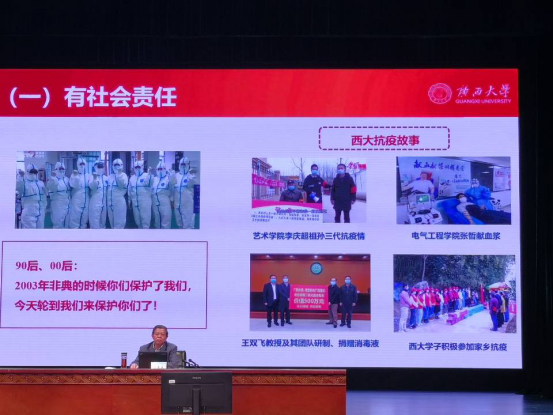 其次是“不负韶华,做青春起跑线上的领跑人”。刘书记先肯定了我们2020级大学生生于非典,考于疫情,终上大学的不易和高中时代的优秀正直的品格、自立自主的学习态度。接着引用莎士比亚“凡为过去,皆为序章”的名言,警示我们不要沉溺过往,应当把握当下,展望未来,认真规划自己的大学生活,充实过好每一天,不负青春韶华,当如毛主席所言“自信人生上百年,会当水击三千里”,以吾辈之才,勇担吾辈之责,圆梦未来。