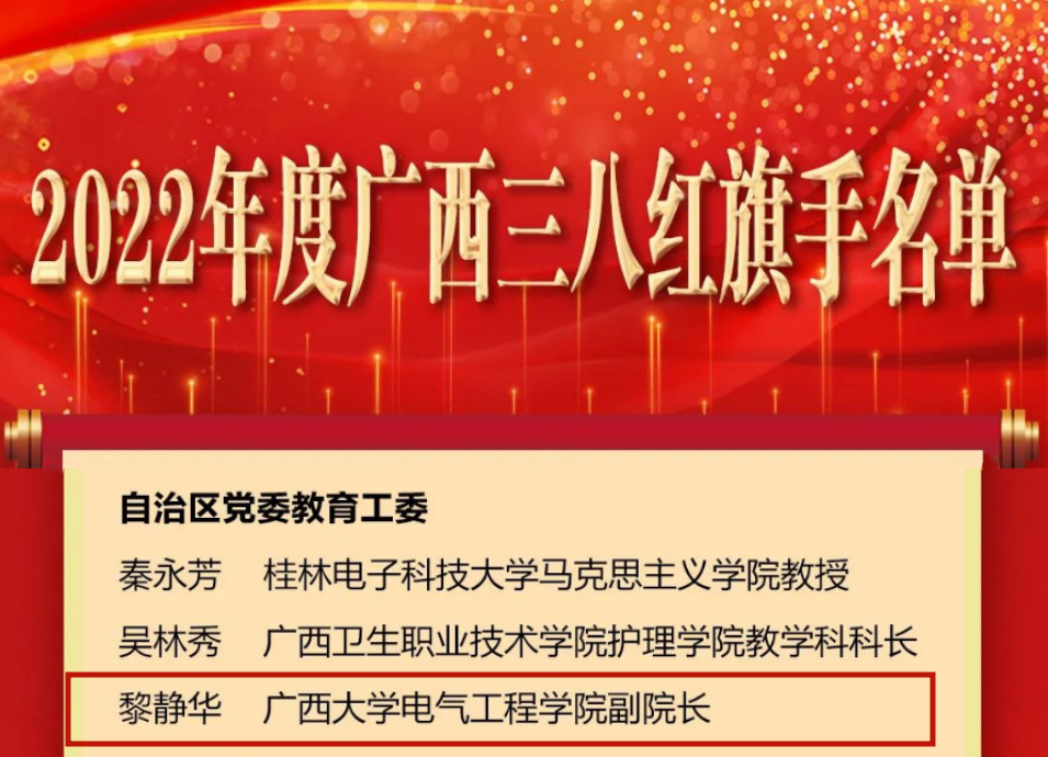 在国际妇女节到来之际,自治区妇联公布了2022年度广西三八红旗手标兵、广西三八红旗手、广西三八红旗集体名单。我院副院长黎静华教授获2022年度“广西三八红旗手”荣誉称号。
