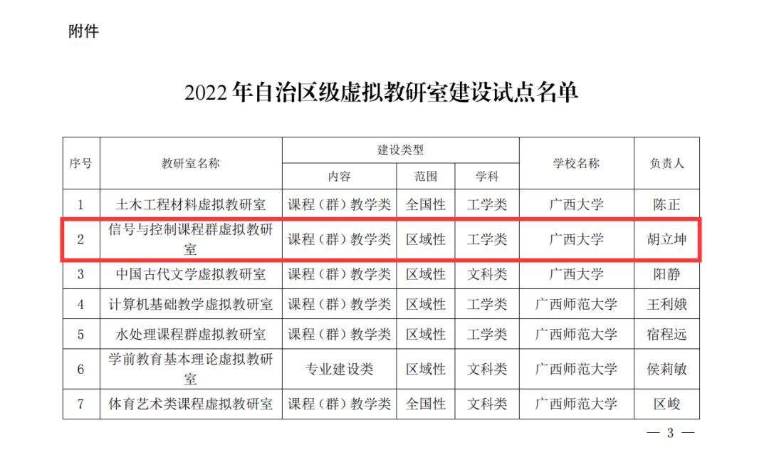 近日,广西壮族自治区教育厅公布了2022年首批自治区级虚拟教研室建设试点名单,经高校申报、专家遴选,我院胡立坤教授牵头的信号与控制课程群虚拟教研室入选。该虚拟教研室参建单位包含了区内所有含自动化类专业和电气类专业学校。