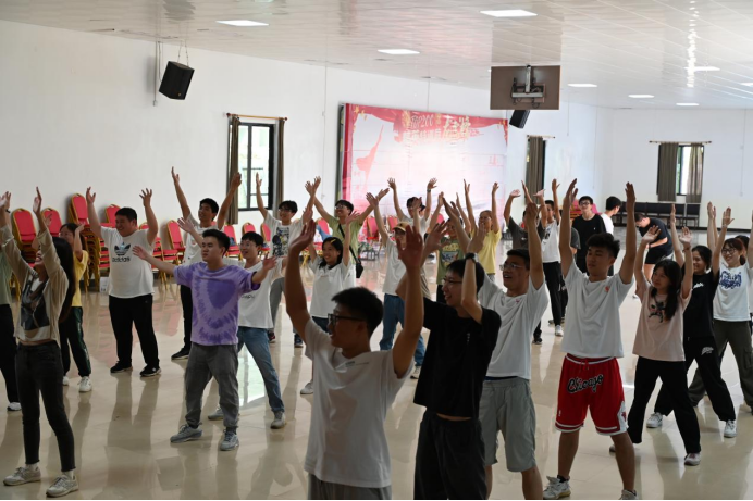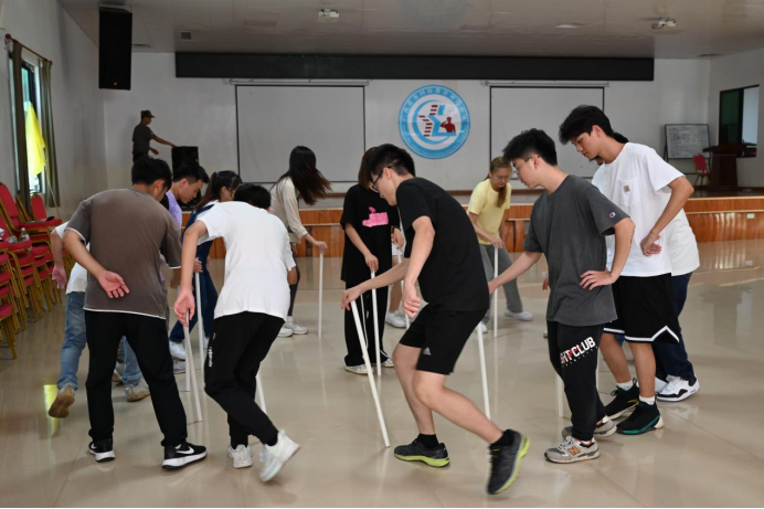在短暂的休息之后,同学们在教官的带领下跟随着欢快的音乐节奏进行了热身运动以及拓展娱乐活动——不倒森林。不倒森林活动在每一次的移动中考察了同学们的身体协调能力与团队合作精神,有利地帮助同学们树立了主动沟通的意识,增强了团队协作的能力。