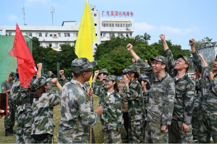 在教官的指导下,全体学员换上迷彩服后在草地集结,选出三名队长和三名政委,并与各自队员商议好了队名、口号、队歌以及队伍的招牌动作。