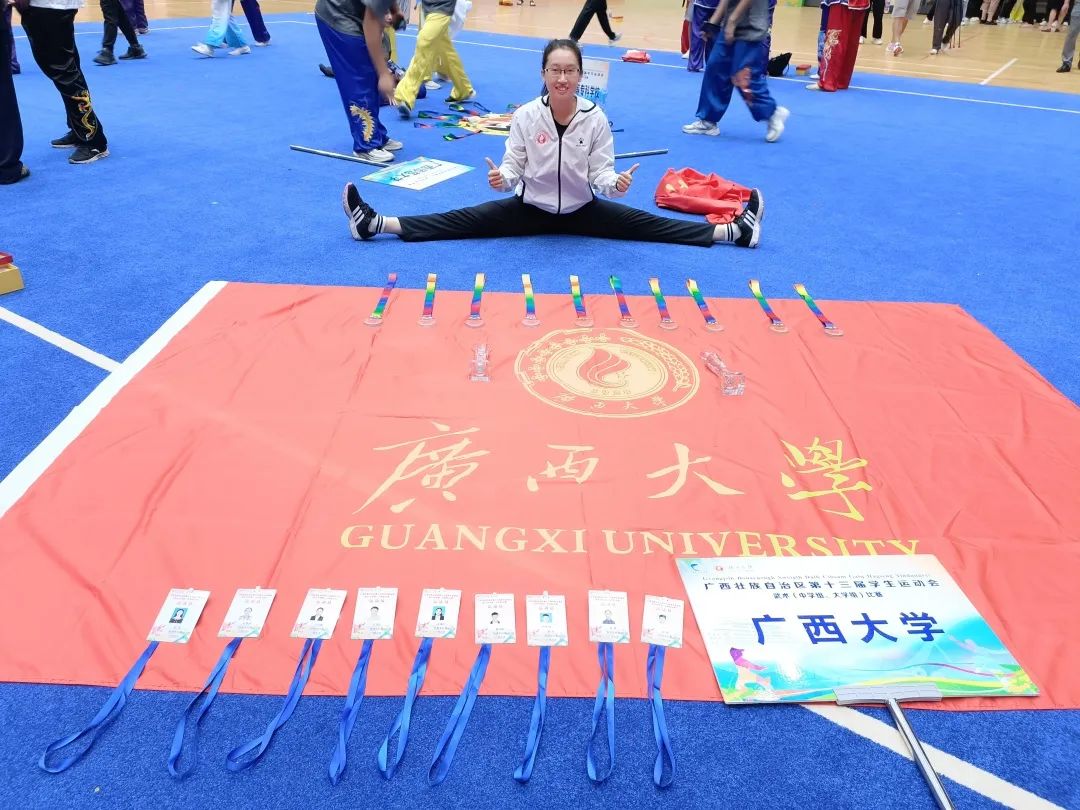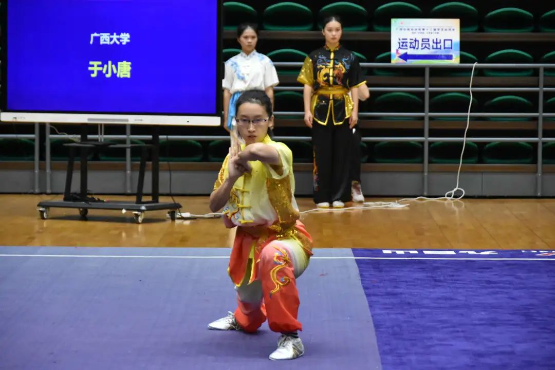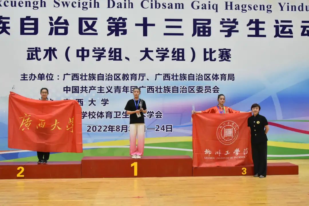 2022年8月24日,由广西壮族自治区教育厅、广西壮族自治区体育局、共青团广西壮族自治区委员会联合主办的广西壮族自治区第十三届学生运动会武术(中学组、大学组)比赛在广西大学综合体育馆落下帷幕。我校武术队在比赛中成绩斐然,其中,我院能动213班于小唐获得女子三路长拳冠军、女子长拳段位套路三段亚军、女子自选刀术第七名,电自213班覃纯真获得男子自选刀术第五名的好成绩。