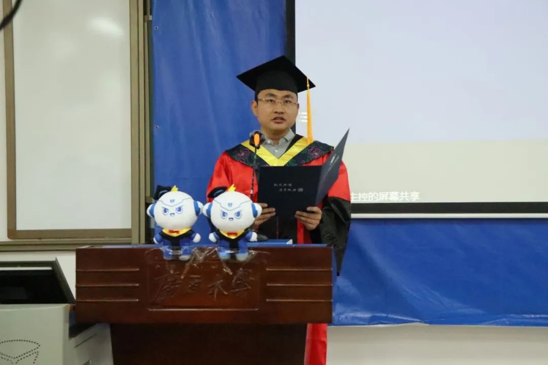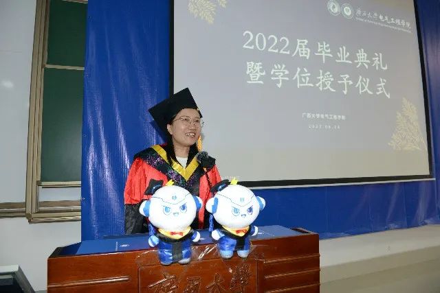 6月24日上午,广西大学电气工程学院2022届毕业典礼暨学位授予仪式在第六教学楼拉开序幕,院党委书记梁志坚、院长双丰、副院长胡立坤、副院长刘辉、副院长黎静华、副院长于婷、研究生导师代表、毕业班班主任和全体辅导员出席典礼。院党委副书记雷圆媛主持毕业典礼。