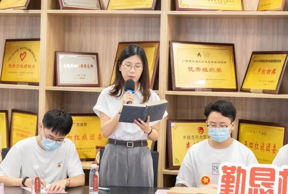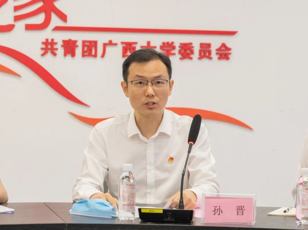 孙晋表示很高兴在红色五月参加此次团日活动,他从五个方面对广西青年提出了要求,他认为新时代广西青年应该牢记初心使命,做到心中有信仰,脚下有力量;应当练就过硬本领,做到刻苦学习,锐意创新。应当勇于攻坚克难,敢于斗争,善于斗争;要勇于吃苦,艰苦奋斗,学习和弘扬雷锋精神;应该锤炼高尚品德,争做向善向上好青年,同学们要心存戒惧,牢记“从善如登,从恶如崩”的古训,严格遵纪守法,明辨是非。