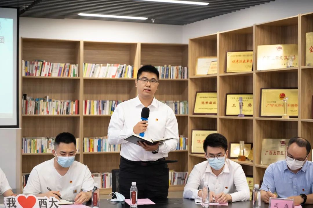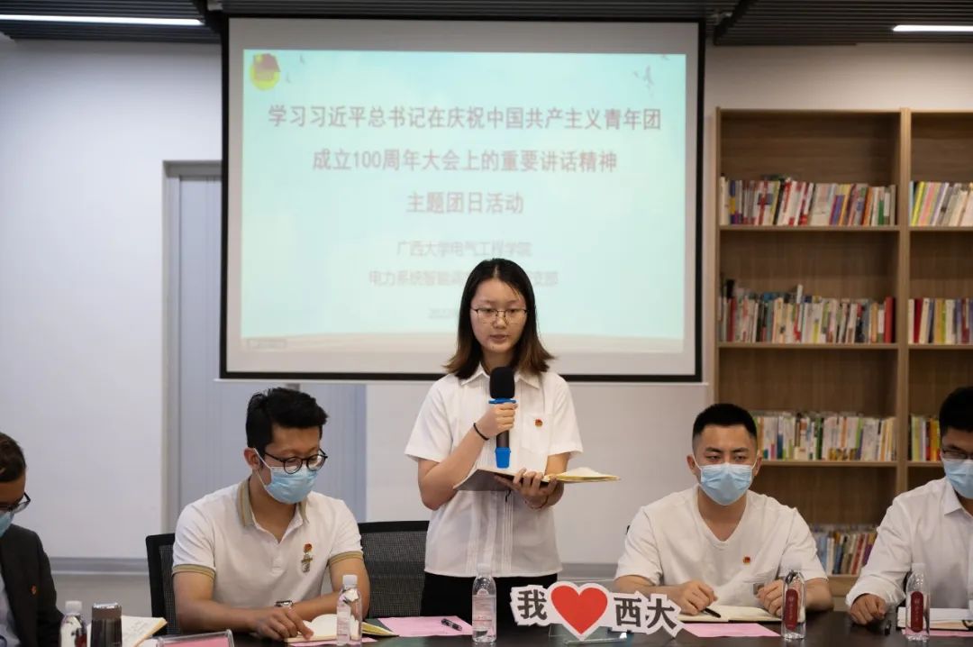 5月19日下午,我院功能型团支部——电力系统智能调度与控制团支部在大学生活动中心青年之家开展“学习习近平总书记在庆祝中国共产主义青年团成立100周年大会上的重要讲话精神”主题团日活动。共青团广西区委副书记孙晋出席活动并讲话。共青团广西区委组织部副部长、机关纪委书记周岚,共青团广西大学委员会书记谢能重,第25届“广西青年五四奖章”获得者、我院副院长黎静华教授,我院全体团委老师及电力系统智能调度与控制团支部全体成员参加活动。