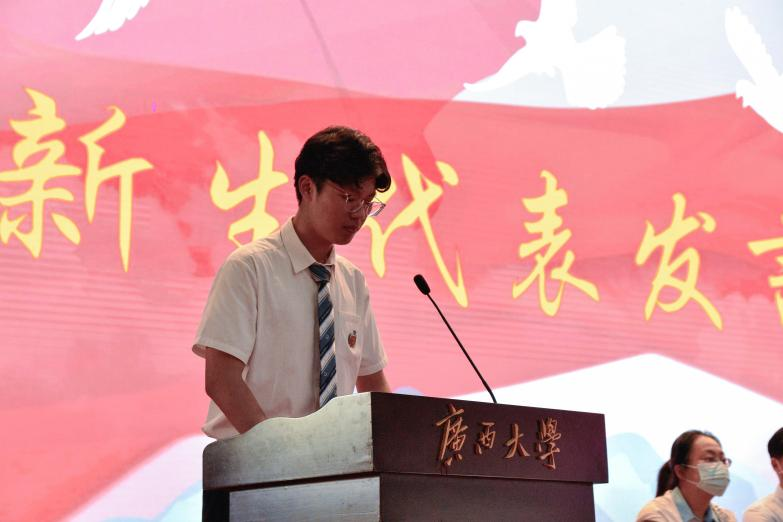 研究生团委副书记谭思源和学生会主席蒙军分别作为高年级代表做了发言,他们代表全体高年级学生对新生的到来表示欢迎,并表示生逢盛世,使命在肩,当不负盛世。新生代表康子瑞表示,身为西大人,应当以马君武校长为榜样,以勤恳朴诚,厚学致新的校训立言力行,勇往直前。