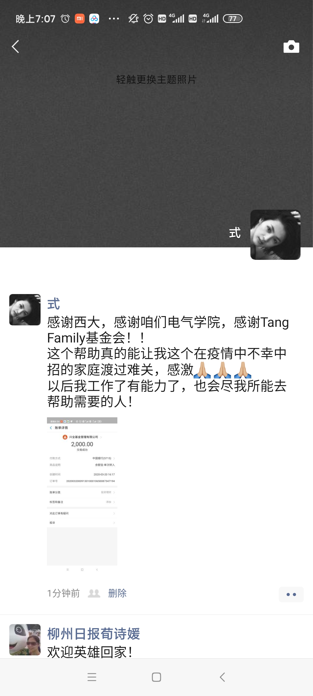 王子潇同学说:“身为湖北的学生我感谢广西大学,感谢电气学院党委的体恤,感谢Tang Family 基金会唐总的大爱,疫情无情,人间有爱!我在湖北省孝感市,也是疫情重灾区,宅家近两个月的时间,我有对疫情的恐惧,也有对生命的敬畏,看见国家倾全国之力救助湖北,我们全家都很感动,我要在今后的研究生学习中精进学业,专注课题,毕业后报效祖国!”