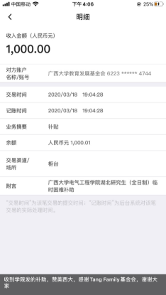 春风送暖,西大校友用爱传递力量,传递希望。疫情发生以来,广西大学电气工程学院严格做好学院疫情防控各项工作,也切实做好受疫情影响学生的兜底保障工作,织密织牢社会安全网。近日,经学院党委研究、提议并征得Tang Family基金会唐总的同意后决定:从电气学院校友捐款设立的“Tang Family奖学金”中拿出 7.2 万元,用于资助电气学院湖北籍学生及新冠肺炎确诊的学生,帮助他们缓解疫情防控期间面临的经济压力。
