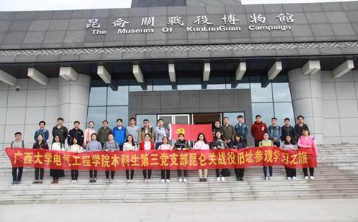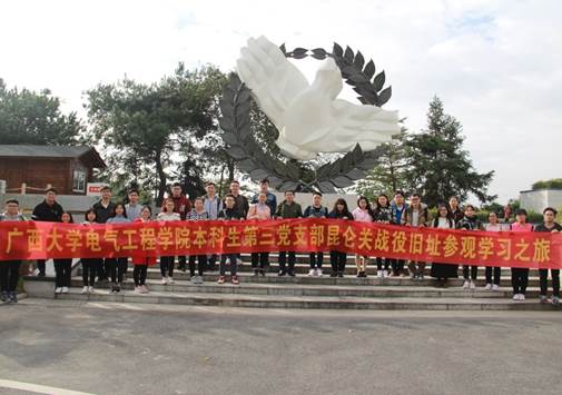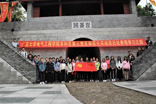 2017年12月3日,广西大学电气工程学院本科生第三党支部一行三十名学生党员在王支柱老师和孙晓黎老师的带领下赴抗战旧址——昆仑关战役旧址参观学习,接受老一辈抗战英雄事迹的再教育。期间参观了昆仑关战役博物馆、昆仑关古关楼、昆仑关战役阵亡将士墓园、昆仑关战役纪念塔、抗战碑亭等,并在昆仑关战役博物馆通过声、光、电的形式让同志们感受当时抗日战争的情形。这次活动给学院本科三支部的党员上了一堂深刻生动的抗战事迹教育课,丰富了爱国主义教育的内容,激发了同志们的爱国主义情怀。