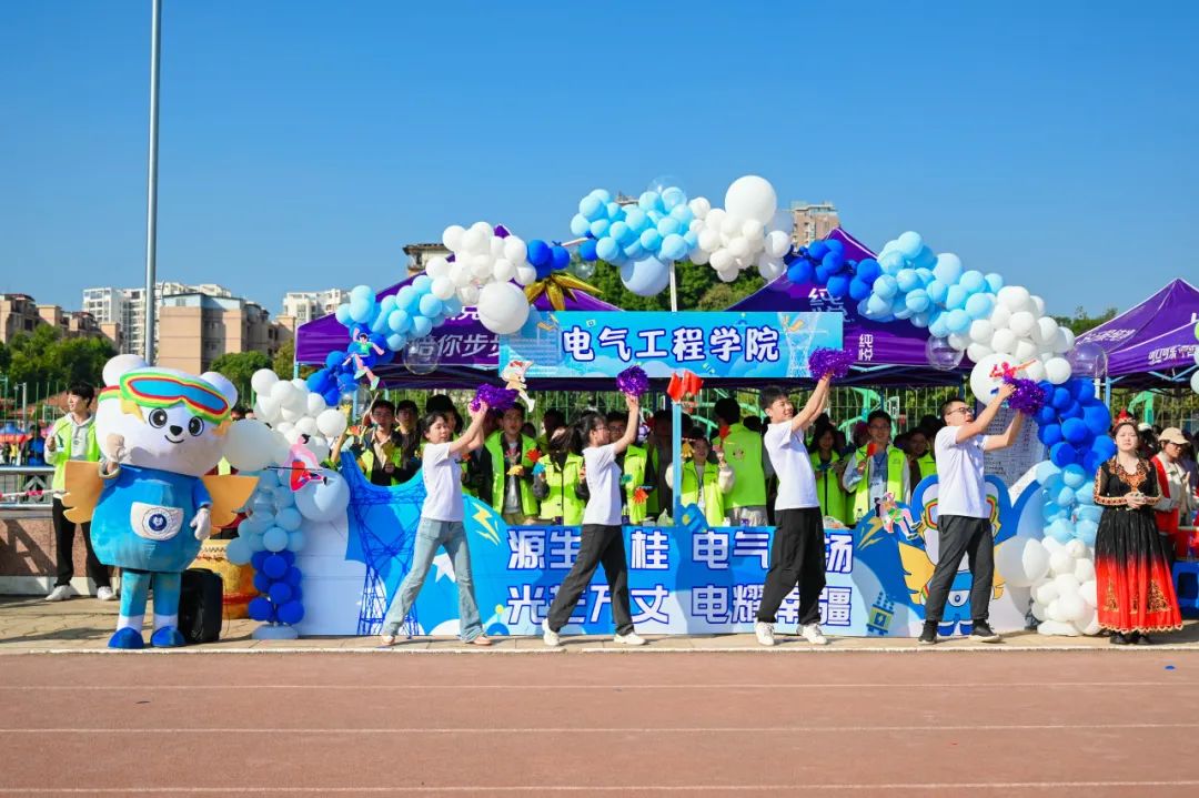 我院运动健儿积极参加竞赛项目。8日上午开始第一轮道德风尚评比。我院大本营环绕着蓝色与白色的气球,中间有一块蓝色展板,吉祥物电电熊站在一侧守护着我院大本营。同学们充满活力和激情,在节奏强劲且有力的鼓声中,高喊“源生八桂,电气昂扬,光芒万丈,电耀南疆”的口号,啦啦操队员们用舞蹈展示他们的才华和魅力。电光溢彩,气贯长虹,电气人将青春与活力,团结与友爱展现的淋漓尽致。
