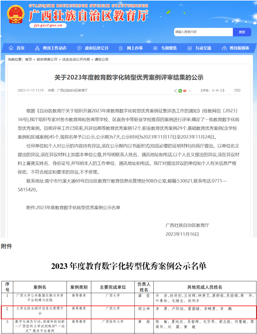 近日,广西壮族自治区教育厅根据《自治区教育厅关于组织开展2023年度教育数字化转型优秀案例征集评选工作的通知》(桂教网信〔2023〕16号),组织专家对各市教育局和各高等学校、区直各中等职业学校推荐的案例进行评审,我院“大学生综合测评信息化管理平台”获评教育数字化转型优秀案例。 图 | 广西壮族自治区教育厅公示信息 “大学生综合测评信息化管理平台”项目是基于学院程序设计大赛竞赛题目孵化的产品,在胡立坤、李勇等老师的指导下,通过组建师生联合研发团队,面向目前大学生综合测评的主要工作,自主研发了一套大学生综合测评信息化管理平台,解决了传统学生综合测评工作中存在的数据采集与管理繁琐以及测评流程不规范、数据保存及分析难等问题。在学院学工组和教学办的大力支持下,多位师生的共同努力下,该平台已在学院近3年的学生综合测评中应用,极大提高了学生综合评价工作的效率,提升了学院办公的数字化与信息化水平。 据悉,在教育数字化转型进程中,电气工程学院始终秉承创新精神和实践探索,致力于构建智慧教育和提升教育教学质量。除“大学生综合测评信息化管理平台”外,我院师生合作自主研发的“教师公共服务学时统计系统”“课程达成度分析信息化系统”等一系列教育数字化平台,也逐步投入使用。在多个数字化与信息化系统的研发中,吸引了我院越来越多的学生参与,近2年,基于学院众创空间平台,通过组织学生参与院级竞赛项目和系统研发项目的训练,培养了百余名具有数字化与信息化系统开发经验的学生。此次优秀案例的入选,也表明我院推进“新工科”教育改革中基于众创空间平台实现理论与实践相结合,“以赛促学、以赛促教、以赛促创”,紧扣实际需求,孵化和转化创新成果的工程教育模式在教育数字化转型中具有代表性和推广价值。 下一步,我院将继续落实上级的各项要求,深化信息技术与教育教学的融合,持续推动教育数字化转型,进一步提升教育质量和效率,为培养更多优秀人才贡献力量。