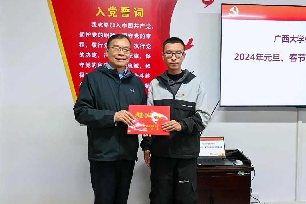 在春节来临之际,为做好党内激励关怀帮扶工作,传递组织温暖,1月15日下午,广西大学党委副书记、校长韩林海,学工部(处)部(处)长黄必春,党办校办副主任廖文丹,党委组织部副部长陈世扬等一行4人到我院走访慰问生活困难党员。院党委书记梁志坚、院长武新章、团委书记石建有、团委副书记蒋冬连以及学生党员代表刘洧杰参加本次慰问活动。