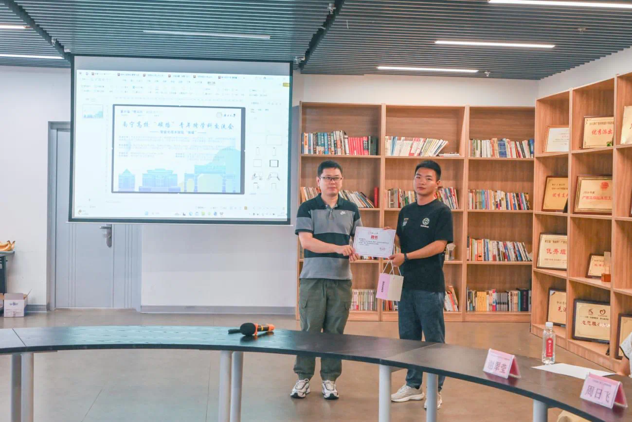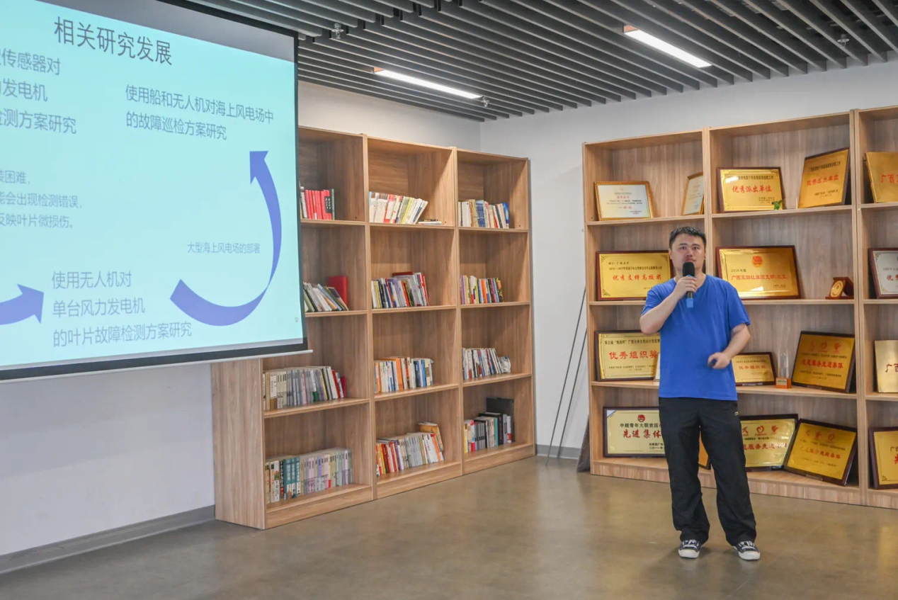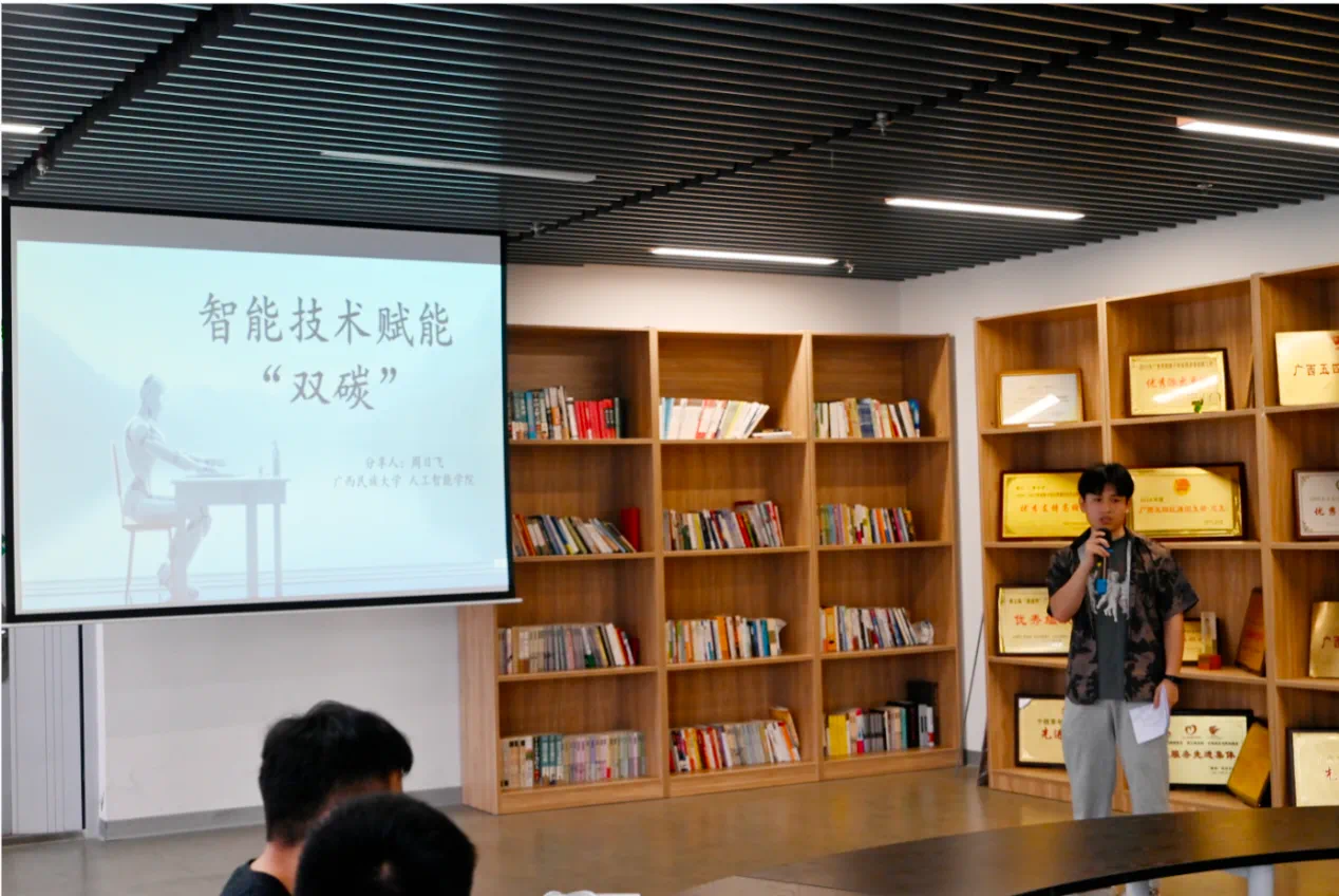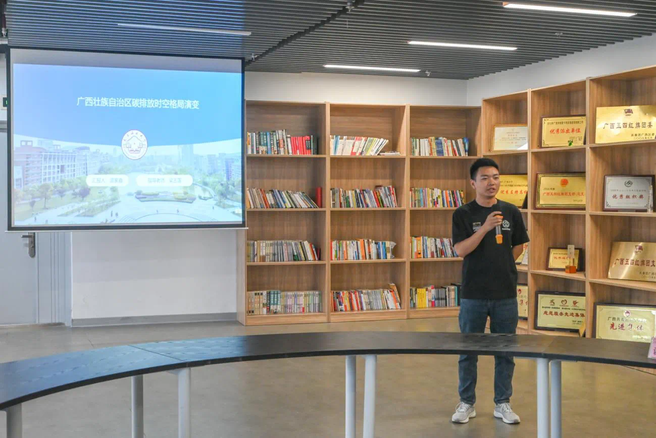 来自广西大学电气工程学院的黄羡飞分享了《基于通信策略的船助无人机巡检方案研究》,设计了使用船和无人机对海上风电场中的故障巡检方案;广西医科大学公共卫生学院的欧柳娟同学分享了在医学领域比较重要的数据库;广西民族大学电子信息学院的姚康同学分享了考虑智能负荷的频率响应资源优化调度方法;广西民族大学人工智能学院的周日飞同学介绍了他们利用人工智能技术开发的鹰眼警情分析系统;广西大学机械工程学院的赵星辰同学分享了利用微波热解系统,有效且低成本地将生物质原料转化为生物柴油的清洁实验;广西中医药大学公共卫生与管理学院的谢翠微同学结合广西多地分级诊疗建设情况,分享了调研的思考;南宁师范大学地理科学与规划学院谭家鑫同学运用地图可视化和莫兰指数分析,为制定碳减排政策提供建议;广西大学化学化工学院的徐爱浩同学分享了高效电催化CO2还原制备甲酸盐技术。