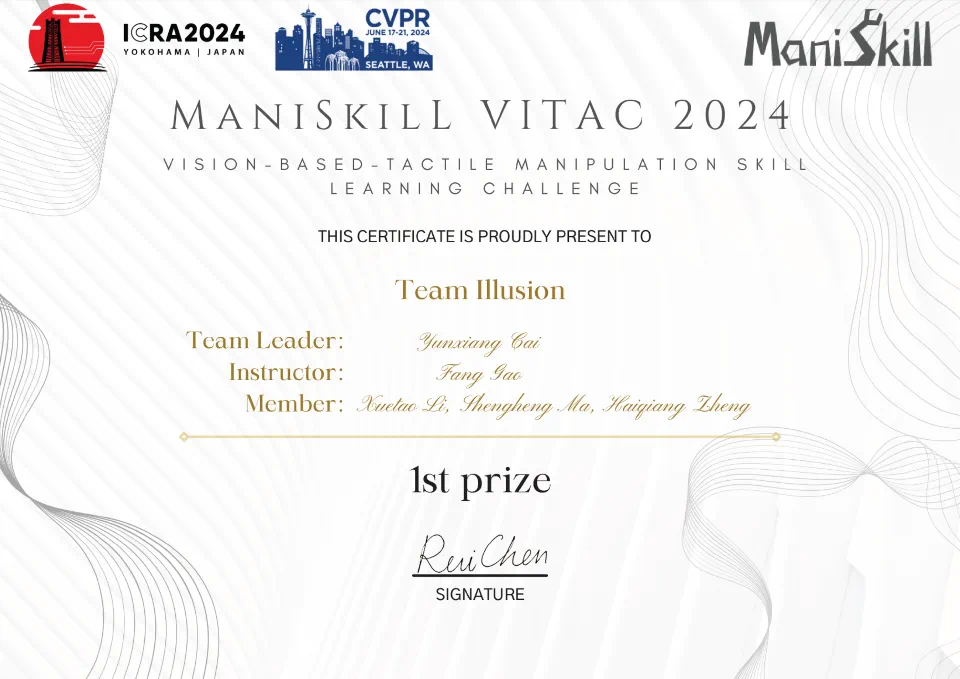 近日,历时2个月的CVPR 2024具身智能研讨会视触觉操作技能挑战赛ManiSkill-ViTac落下帷幕,我院高放教授带领的ILLUSION团队在本次挑战赛中荣获冠军。 本次获奖的ILLUSION团队由蔡运翔、李雪涛、麻胜恒、郑海强四位成员组成。5月17日,该团队将以比赛冠军身份参加ICRA2024第五届ViTac国际研讨会(Robot Embodiment through Visuo-Tactile Perception),我院控制工程专业2022级研究生蔡运翔将作为团队代表在会上做学术报告。 获奖证书 据了解,本次Maniskill-ViTac挑战赛由清华大学、美国加州大学圣地亚哥分校以及伦敦国王学院联合举办。ManiSkill系列挑战赛致力于让机器人学习到可泛化的物体操作技巧,旨在训练出像人类一样能与3D世界互动的具身智能机器人。与历届ManiSkill赛事不同,本次ManiSkill-ViTac挑战赛提供了通用触觉传感器的物理仿真平台和搭建了现实触觉传感器机器人评估平台。作为视觉触觉领域的首个公开赛事,本次比赛提出插销(peginteration)和开锁(lock opening)的任务训练及评估,旨在推动基于视觉触觉的操作技能学习在具身智能和机器人应用中的突破。 基于视觉触觉传感器的插销任务的仿真与实验 ILLUSION团队针对初期模型训练低下的问题,从基线收集演示数据,基于成功率、完成步数和抖动情况三个指标筛选出专家数据,采用了混合专家数据的生成式对抗模仿学习方法,对TD3强化学习框架进行权重预训练。同时,对策略网络引入了噪声来提高模型的鲁棒性。在微调阶段,该团队也设计了多阶段的微调策略来提高模型的表征能力。 基于视觉触觉传感器的开锁任务的仿真与实验 据悉,此次比赛也吸引包括清华大学、浙江大学、同济大学、伦敦国王学院、南洋理工大学、新加坡科技研究局(ASTAR)及信息通讯研究所(I2R)等国内外知名高校和科研机构参与。该挑战赛的获奖体现了我院近年来紧跟国际学科前沿,全面提升人才培养质量,紧扣“双一流”学科建设取得成效。