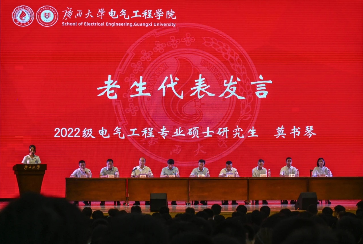 2022级电气工程专业研究生莫书琴同学代表全体老生发言。她回顾了在广西大学度过的数个春秋,同时分享了自己的感悟:学习之旅存在着深远的意义,新生们要打好专业基础,培养专业兴趣,注重知识积累与创新,勤学好问,勇于探索未知领域,以智慧之光照亮前行之路。