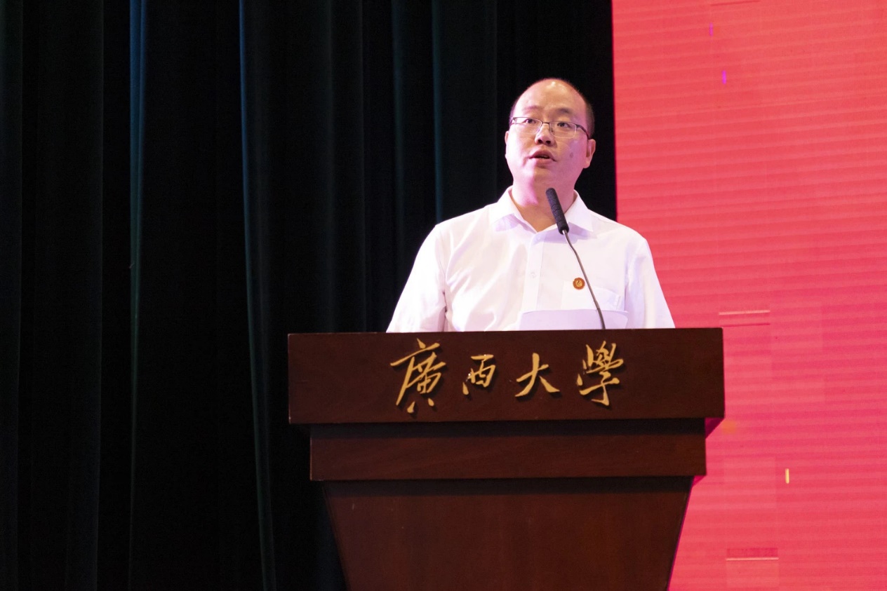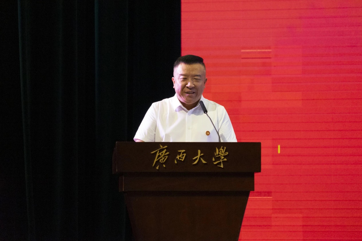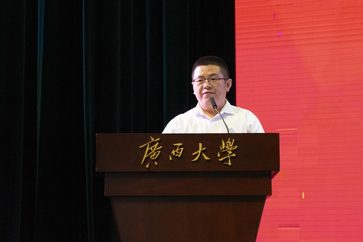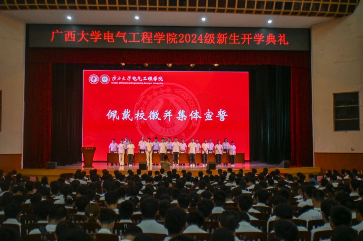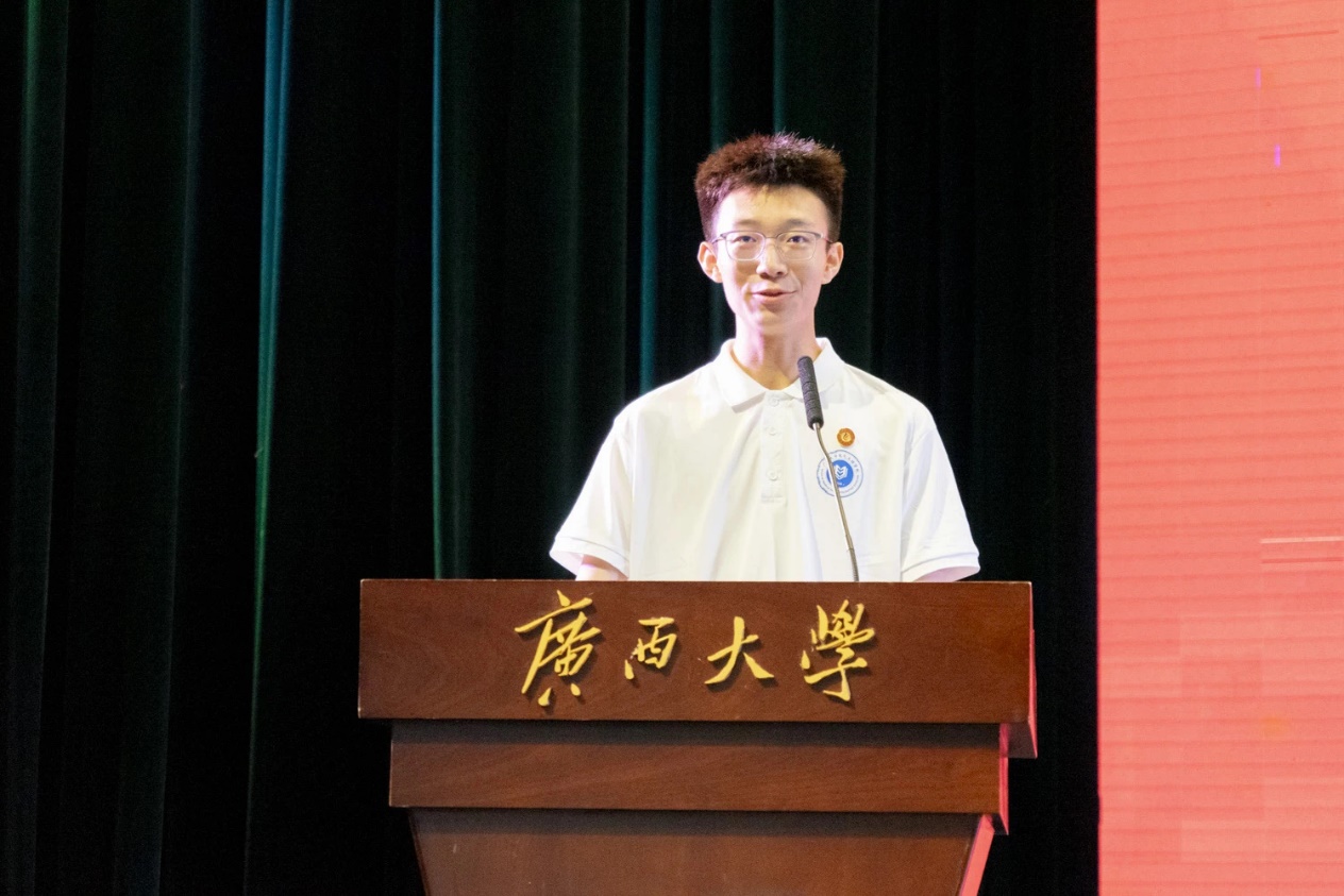 典礼上,学院领导老师为新生代表佩戴校徽,期望新生弘扬“创新创造、奋勇争先、全面一流”的广西大学“双一流”精神,与新时代同向同行、共同前进,努力争做堪当民族复兴重任的时代新人。