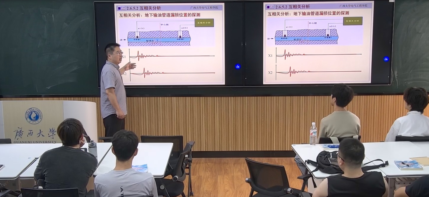 在课程后半段,在韦老师结合板书、多媒体和短时视频动画,讲解、推导和分析互相关分析法的数学原理和特点的基础上,以“使用互相关分析法监测地下输油管道泄漏位置”的工程案例,介绍我国“一带一路油气合作”项目取得的成果,使同学们在深刻理解“一带一路”时代内涵的同时,树立了专业自信和服务“一带一路”建设的理念,增强了“学有所成、技术报国”信念。