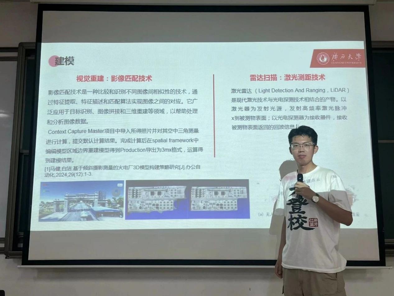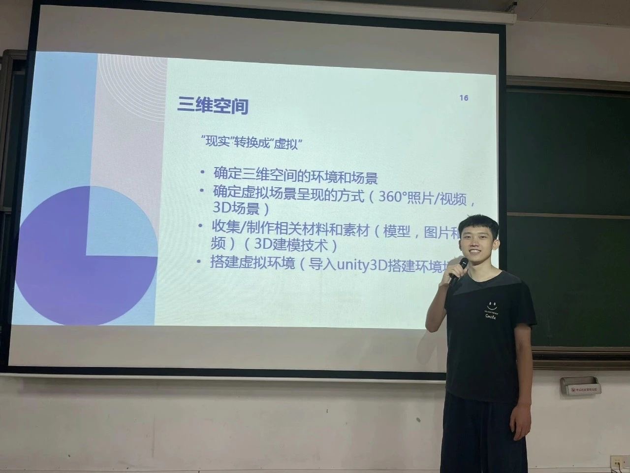 来自电自218班的翁振淇同学,则热情洋溢地与同学们探讨了基于面向对象的程序设计与虚拟现实技术实现现实环境转换为虚拟场景提供给用户使用的软件系统。他详细介绍了如何在没有时间空间的限制随时随地实现虚拟现实技术,并且仔细阐述了3D建模技术和自然交互技术,拓展同学们在虚拟现实领域的视野,扩充同学们的知识面。