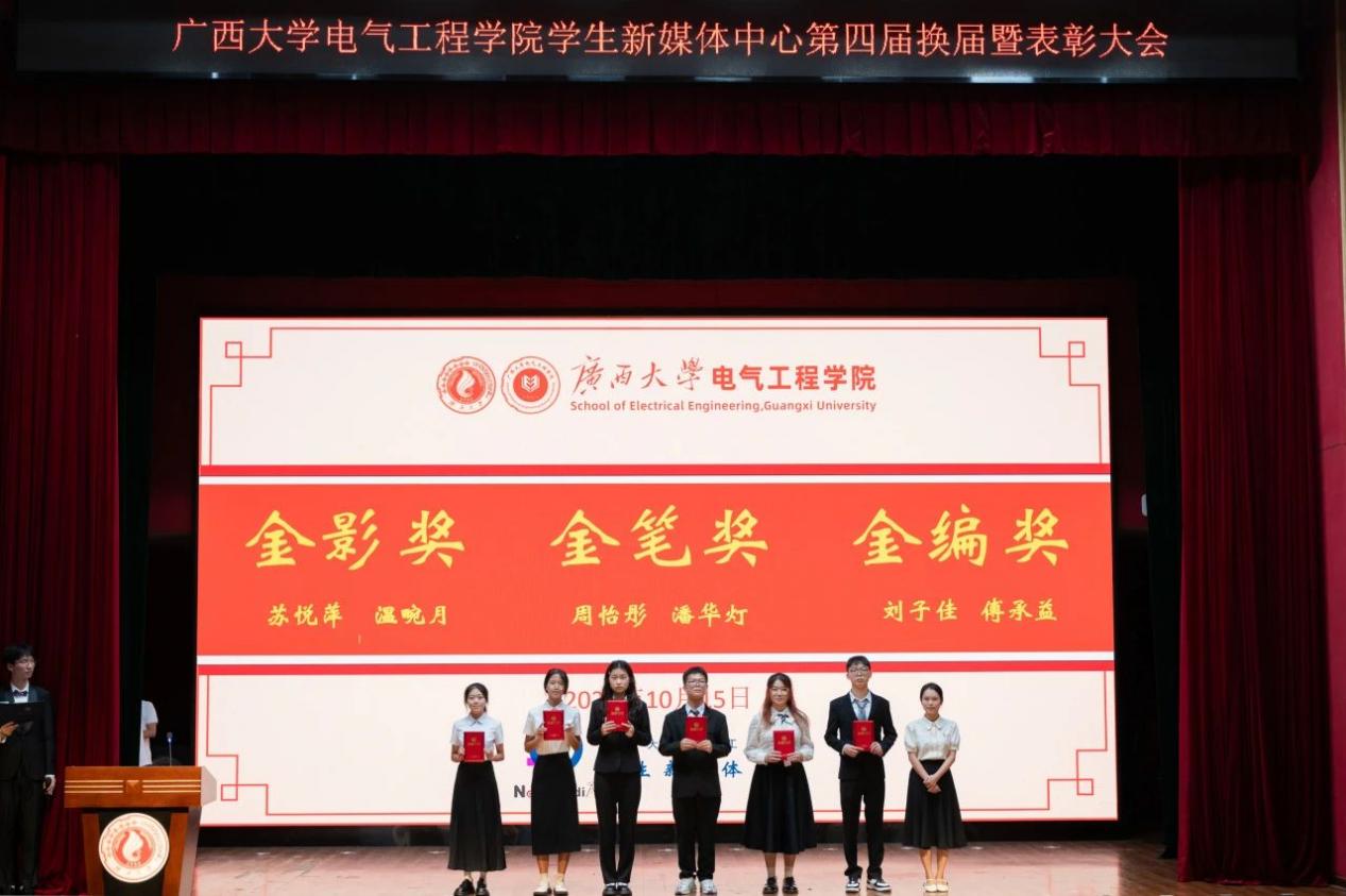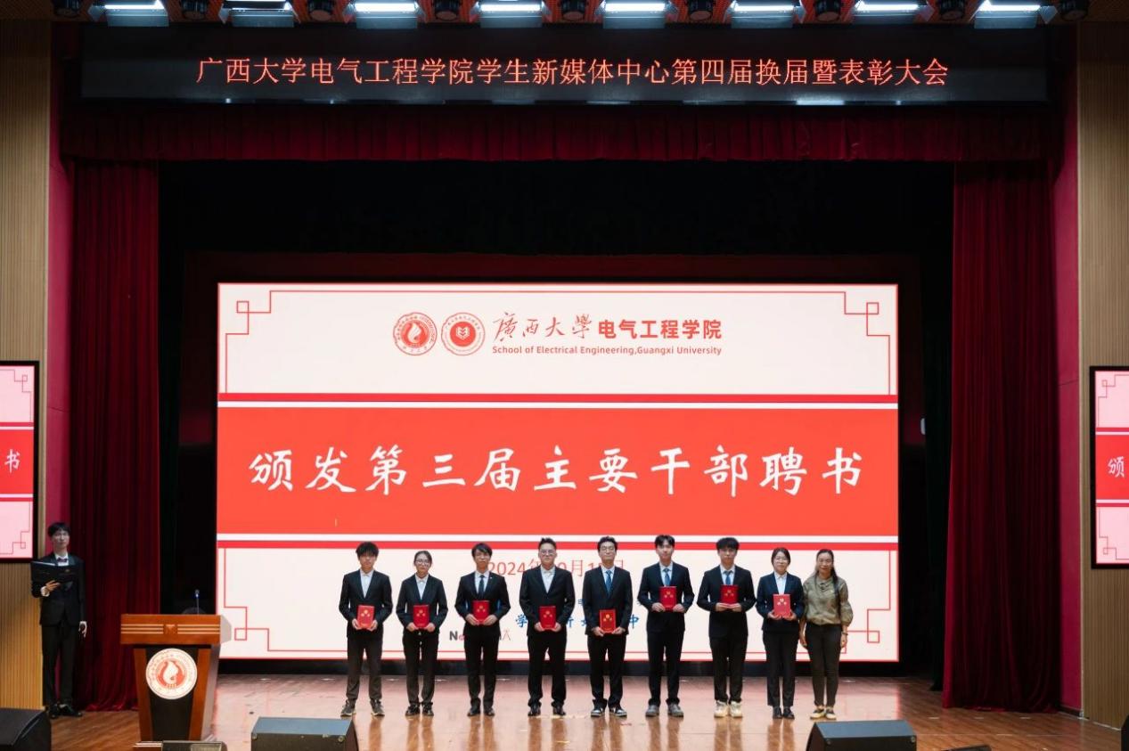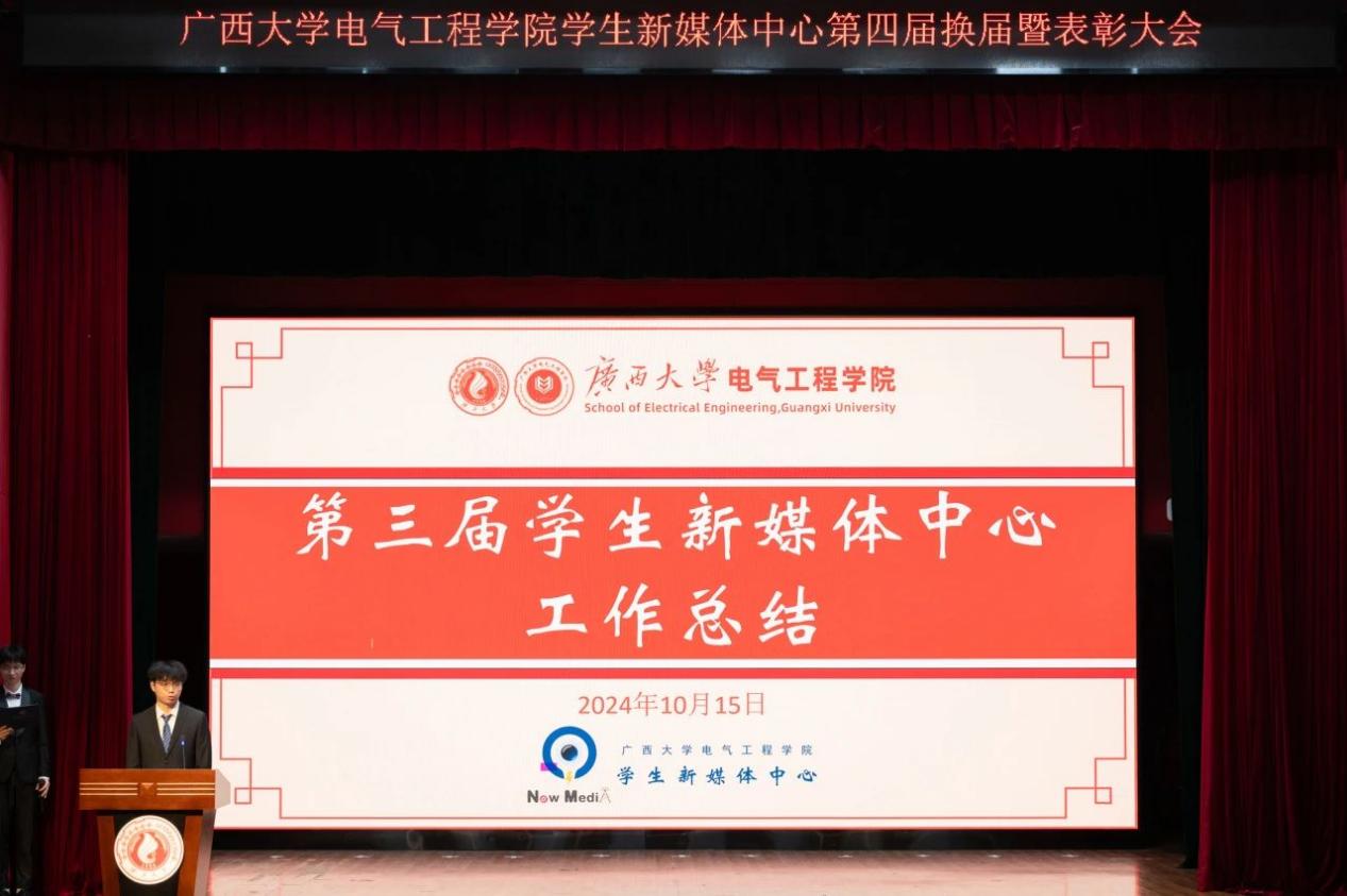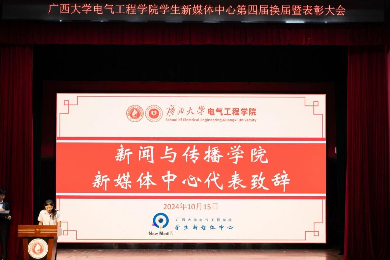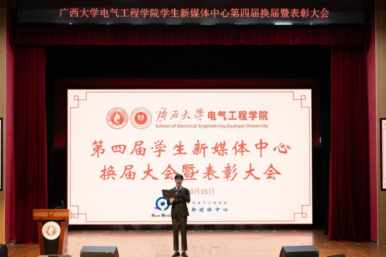 10月15日下午,广西大学电气工程学院学生新媒体中心第四届换届暨表彰大会于大学生活动一楼小剧场顺利举行。团委副书记蒋冬连、李娟,中心指导老师冯敏等老师代表出席会议,新闻与传播学院新媒体中心代表以及各兄弟学生组织代表、电气学院学生新媒体中心全体成员参加会议。
