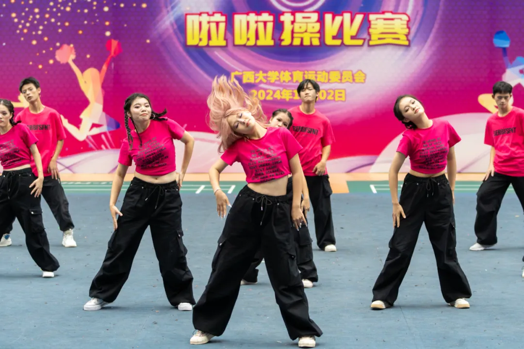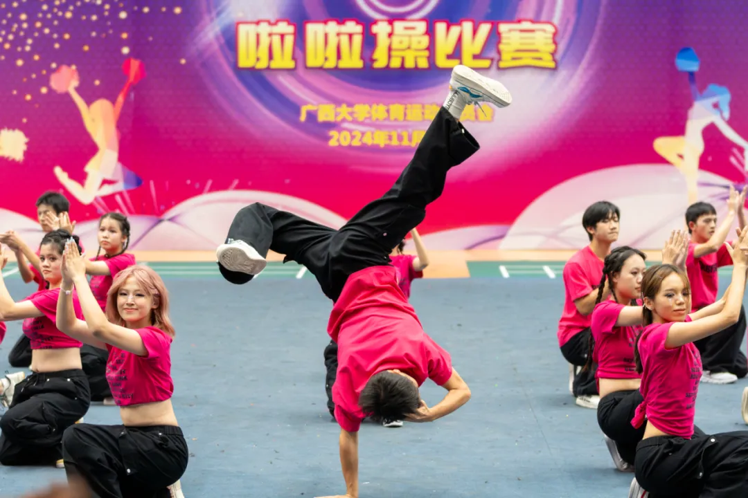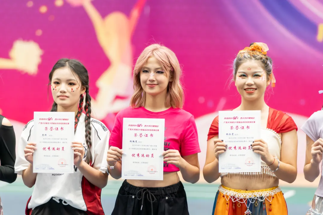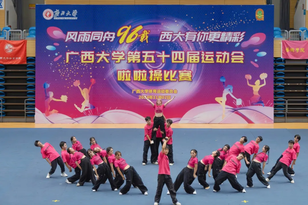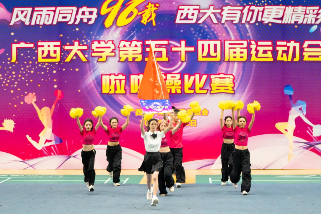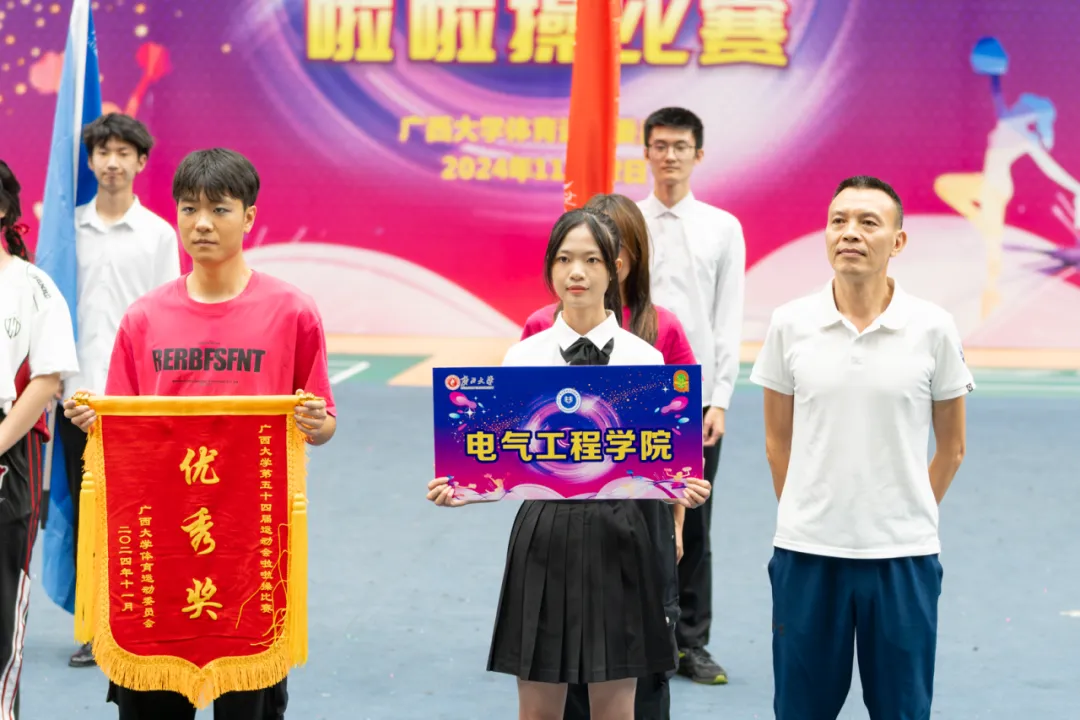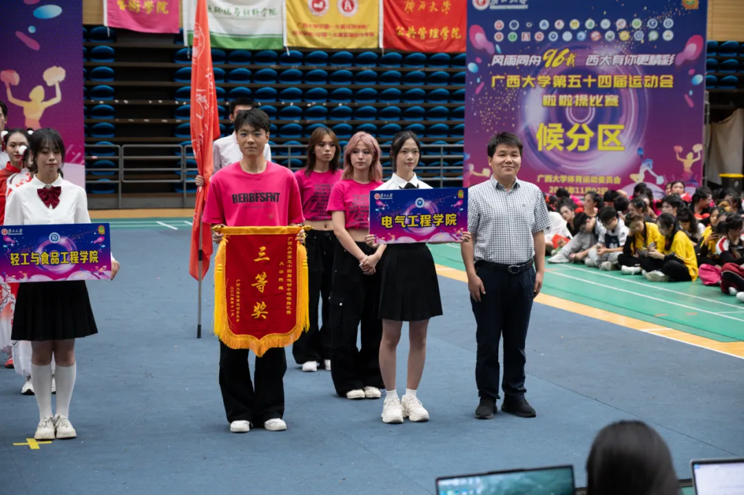 01 开幕式及颁奖 风雨同舟96载,西大有你更精彩。11月2日下午,广西大学第五十四届运动会啦啦操比赛在西校园综合体育馆如期开幕。经过一番“舞动乾坤”的较量,我院参赛队伍荣获大学院组三等奖、体育道德风尚奖及优秀奖。 开幕式我院队伍入场 我院荣获三等奖 我院获得奖励 02 啦啦队风采 电气工程学院啦啦操运动员们身着绚丽夺目的火龙果色队服,如花的笑脸绽放着青春的活力。他们如盛放的花朵,更如点燃夜空的烟花,尽显生命力量! 啦啦队员在表演 啦啦队员在表演 英姿飒爽,自信张扬,像划破黑暗的电光,他们的每次旋转跳跃都能让人眼前一亮! 啦啦队员在表演 啦啦队员在表演 他们用激情和汗水,在赛场上书写着青春华章,尽显青春活力之美,让满场观众无不沉醉在这热血沸腾的活力盛宴中,为他们献上热烈的掌声!继续带着刻苦拼搏精神向前走吧,奋进的电气学子们!文明其精神,野蛮其体魄,为建设更积极向上的校园文化贡献青春力量! 我院仇翘楚同学(中)获得“优秀运动员”表彰 我院学子在加油助威 赛后合照