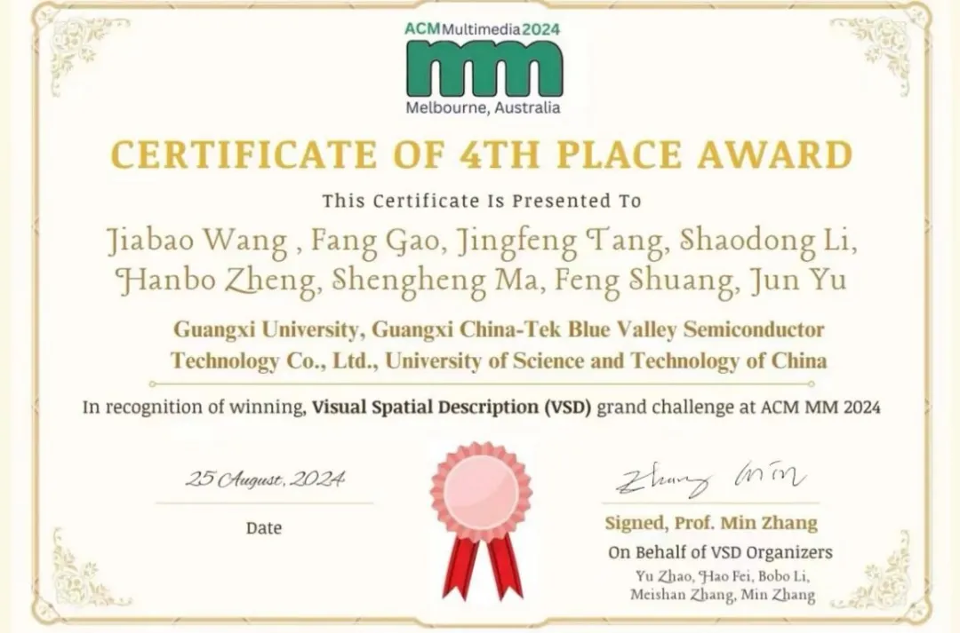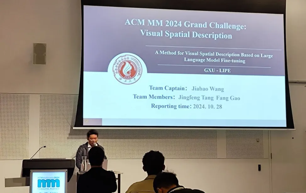 近日,第32届ACM国际多媒体会议在澳大利亚墨尔本落下帷幕。该会议由美国计算机学会(Association for Computing Machinery,简称ACM)主办,同时其主办的视觉空间描述重大挑战(Grand Challenge: Visual Spatial Description,简称VSD2024)公布竞赛结果并颁发获奖证书。我院广西电力装备智能控制与运维重点实验室高放教授带领的GXU-LIPE团队荣获挑战赛第四名,同时受邀撰写论文并进行口头报告。 所获奖状 ACM Multimedia是由美国计算机学会主办的计算机视觉和多媒体处理领域的顶级国际会议,也是中国计算机学会推荐的该领域A类国际学术会议。每年大会特设主题挑战竞赛(Grand Challenges),遴选自全球相关领域的前沿主题。 VSD2024属于视觉空间语义理解的研究领域。在该挑战赛中,模型需要生成一个准确的文本描述句子,来描述输入图像中两个给定目标对象之间的空间关系。主办方提供了一个大规模的视觉空间描述数据集,包含29,272个高质量手动标注的图像—文本对。 GXU-LIPE团队由高放教授和课题组研究生王家宝、唐镜峰组成。团队受邀撰写了论文《A Method for Visual Spatial Description Based on Large Language Model Fine-tuning》发表在第32届ACM国际多媒体会议,并前往墨尔本进行口头报告。 科研团队在做报告 GXU-LIPE团队设计了一种创新的基于大模型的方法,通过微调大语言模型FLANXXL提升了视觉空间关系描述的效果。首先通过预训练模型提取图像特征和文本特征,然后采用Q-former进行特征融合,最终通过大语言模型输出文本描述。为解决LLM特征捕获困难的问题,将原始特征与融合后的特征一并输入FLANXXL,并采用数据增强、先验知识和多种训练策略等进行微调,具体包括提升文本多样性、引入对象重叠先验、基于动量蒸馏筛选难负样本及生成软标签,基于权重平衡长尾数据等。通过多模态特征融合和微调,模型在挑战赛测试集上表现优异,生成了准确且更真实的对象空间关系描述文本。 概念图 本次参加ACM MM会议由广西大学“2024年研究生素质能力提升项目”资助,为LIPE重点实验室提供了宝贵的国际交流机会,提升在视觉语言处理、多模态融合、人工智能等领域的科研能力。王家宝同学表示,在多媒体处理和计算机视觉应用的快速发展背景下,此次参会有助于深入了解国际领先的研究动向、结识领域专家,并为后续课题研究提供创新灵感和新的合作机会。