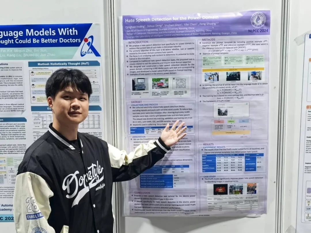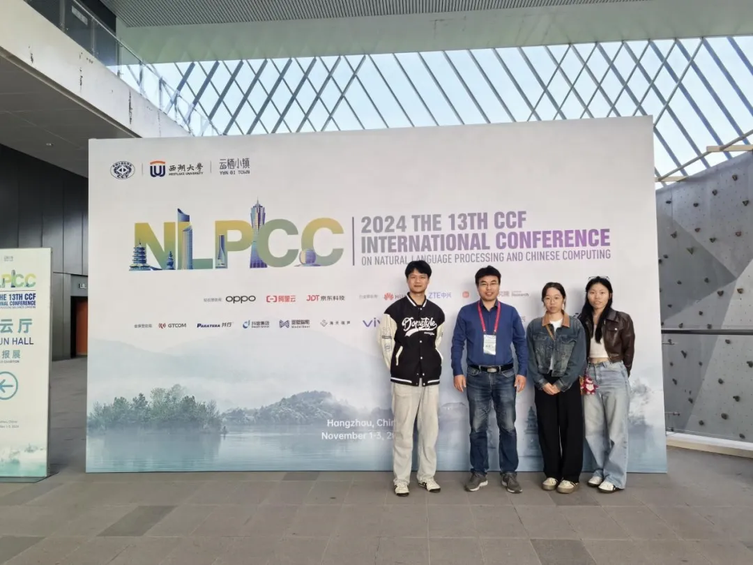 11月1日至3日,由中国计算机学会主办,西湖大学承办的第十三届CCF自然语言处理与中文计算国际会议(International Conference on Natural Language Processing and Chinese Computing,以下简称“NLPCC”)在浙江杭州举办。来自国内外多所高校、科研机构和企业的专家学者齐聚一堂,共同探讨NLP领域的最新进展和发展方向。我院2022级硕士生邓泽华同学获得广西大学研究生倍增计划资助参加本次会议并作论文展示。 师生合影(左一为邓泽华同学) NLPCC从2012年开始举办,至今已成功举办13届,是中国计算机学会自然语言处理技术委员会(CCF-NLP)的年度会议。会议旨在为来自学术界、工业界和政府的研究人员和从业人员提供开放的平台,与会者分享各自想法、研究成果和经验,通过会议可以促进各自在该领域的研究和技术创新。 据悉,本届大会共收到461篇投稿,其中40篇接收为口头报告,121篇被录取为海报(poster)。大会特别设立了海报交流环节,邀请了自然语言处理领域国际顶级期刊和会议论文作者与参会代表进行了现场交流。邓泽华参会论文《Hate Speech Detection for the Power Domain》获得海报展示,该论文提出了一个能源领域的讽刺数据集,为隐喻检测领域探索了一个新的方向。 邓泽华同学做poster展示 会后,邓泽华表示,此次国际会议为他提供了宝贵的锻炼平台,让他有机会与国内外的学术同行进行深入交流与思想碰撞。同时,他对学校提供的资助表达感激,对导师黄清宝教授的耐心指导致以敬意。