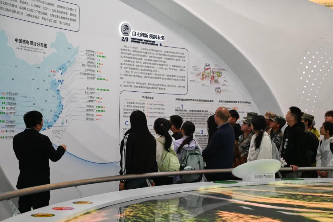 进入防城港市科技馆核电科普展厅,实践团在讲解员的带领下,了解核能在我国的发展历史,感受两弹一星、开业之石等振奋人心的发展历程,这激发了师生们对核电的浓厚兴趣。接下来的参观旅程,科技馆通过环绕式大屏幕,互动式设施等先进设备,向师生们介绍与核电相关的安全知识和白龙一号核电站的基本运作原理。师生们对核能、核电站等概念有了深入的认识,提高了同学们的科技知识素养。