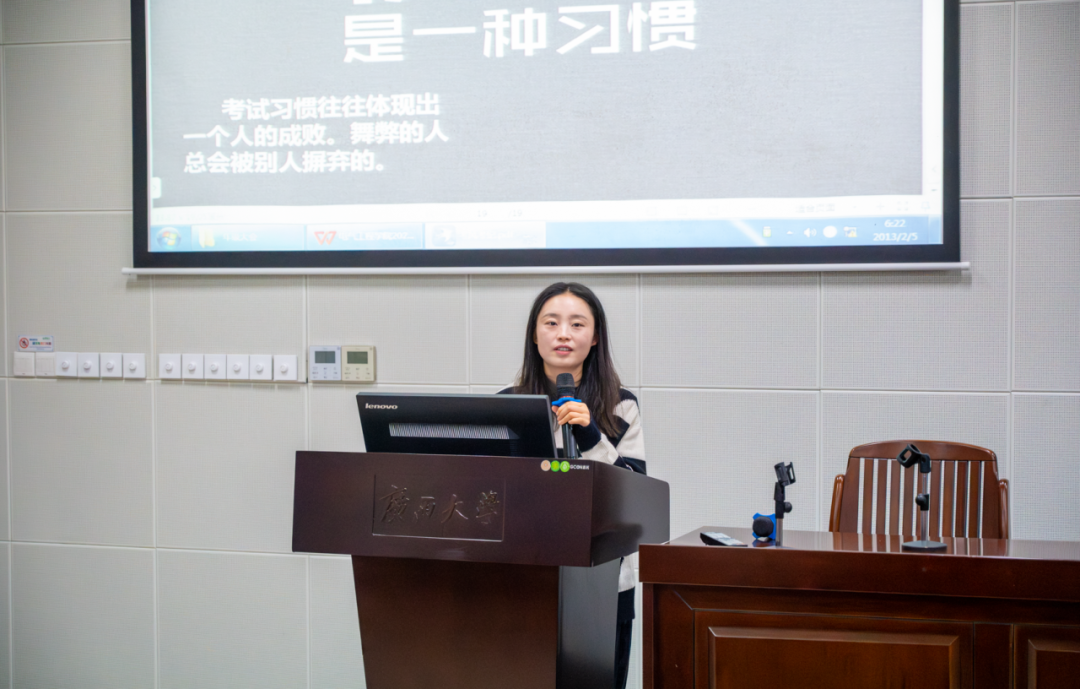 蒋冬连老师围绕考风考纪展开阐述。在考试纪律方面,蒋老师先引领同学们齐读学生手册上《广西大学学生考试违规处理方法》第八条,着重强调考试违规的严重后果。随后,蒋老师针对如何应对期末考试、考场注意要点、缓考补考流程以及挂科重修相关事宜进行细致讲解。最后,蒋老师鼓励同学们积极融入生活,热爱生活,以乐观态度拥抱生活、服务生活,持续提升提出问题与解决问题的能力。