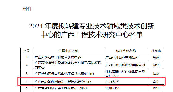 近日,广西壮族自治区发布了2024年度拟转建专业技术领域类技术创新中心的广西工程技术研究中心名单,广西电力输配网防雷工程技术研究中心入选,已经成功转建为广西电力输配网防雷工程技术创新中心,后续因研究方向拓展,将更名为广西电力装备及系统安全技术创新中心(以下简称“中心”)。该中心以产业前沿引领技术和关键共性技术研发与应用为核心,加强应用基础研究,协同推进现代工程技术和颠覆性技术创新,打造创新资源集聚、组织运行开放、治理结构多元化的综合性产业技术平台。中心主要研究广西复杂气候环境下电力装备及绝缘材料安全、数字化防爆电力装备及系统运行安全、电力装备的在线监测和雷电防护等方向,由广西壮族自治区优秀专家、我院教授张镱议担任负责人。