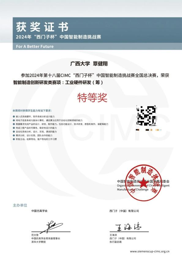 我院研究生在2024年CIMC“西门子杯”中国智能制造挑战赛中,首次在智能制造创新研发类赛项:工业硬件研发(筹)赛项中斩获全国特等奖。