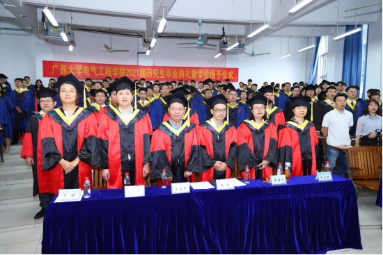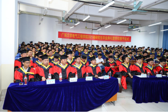 逐风追电,筑梦飞行。6月26日上午,广西大学2021届毕业生典礼暨学位授予仪式在主会场汇学堂拉开序幕,电气工程学院在第十教学楼设立三个分会场观看主会场现场转播。院领导梁京章、双丰、梁志坚、刘辉、黎静华、于婷,学院学位评定分委员会委员、研究生导师代表、毕业班班主任等出席典礼分会场。院党委副书记梁志坚主持电气学院分会场仪式。