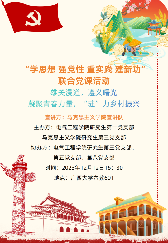 为巩固学习贯彻习近平新时代中国特色社会主义思想主题教育成果,用习近平新时代中国特色社会主义思想凝心铸魂,切实加强党支部的思想建设,2023年12月12日下午,广西大学电气工程学院研究生第一党支部联合学院研究生第三党支部,研究生第五党支部,研究生第八党支部(以下分别简称“我院研一支部,研三支部,研五支部,研八支部”)以及马克思主义学院研究生第三党支部(以下简称“马院研三支部”)在第六教学楼601室开展“学思想、强党性、重实践、建新功”主题教育宣讲会。宣讲会由我院研一支部王伟欢同志主持,马克思主义学院宣讲队成员李宇涵和蒙佳慧同志作为主讲人,两院五支部师生党员共百余人参加。